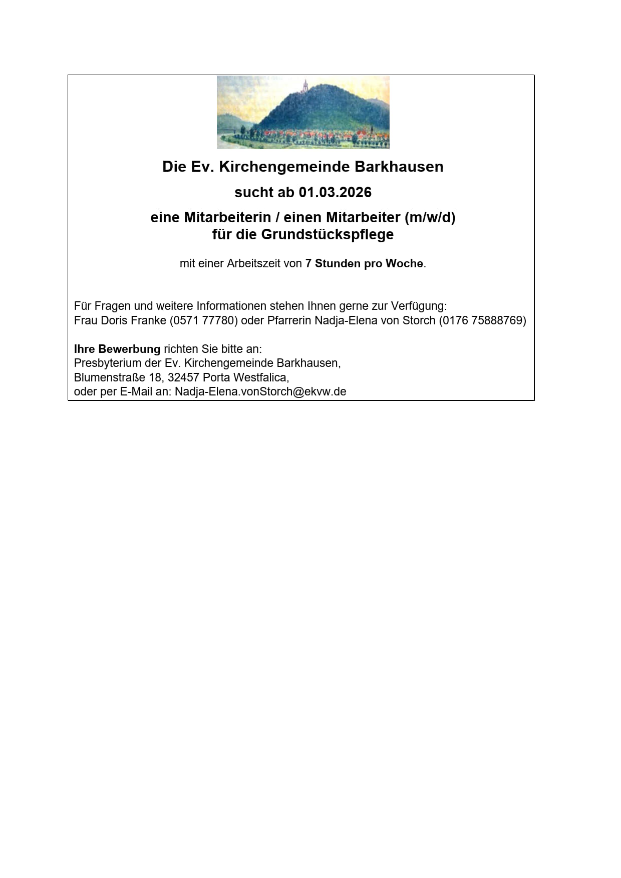 Die Ev.-luth. Kirchengemeinde Lerbeck sucht zum 1. Februar 2026 eine*n Friedhofsgärtner (m/w/d) mit einem Beschäftigungsumfang von 80 % (32 Stunden/Woche).